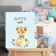 This is a Gifts table sign for the baby shower. Design is an adorable, lion cub with watercolor florals with a baby blue background with soft white dots.