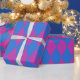 A chic roll of wrapping paper, with a faux-patchwork pattern of diamond shapes, some plain Blue, some Blue dots on a Magenta background.