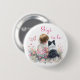 Girl's pink and sage green baby and puppy dog Gigi To Be button. Sweet baby girl sitting next to her little black and white Mini Aussie puppy dog in a patch of pretty watercolor flowers. Pink and sage green butterfly and pretty wildflowers.
