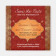 Faux golden edges make a gilded border for this Indian inspired save the date magnet. The background is a deep red with a subtle pattern overprinting it all to enhance an ornate frame containing customised text. The frame is surrounded by four small golden paisley ornaments. Available with matching products.