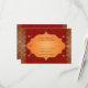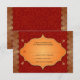 Faux golden edges make a gilded border for this Indian inspired wedding reply card. The background is a deep red with a subtle pattern overprinting it all to enhance an ornate frame containing customised response text. The frame is surrounded by four small golden paisley ornaments. Available with matching products.