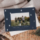 A modern and elegant Christmas holiday card design featuring a horizontal photo on a dark navy blue background dotted with silver foil pine trees. Personalize with your custom holiday greeting, family name and the year beneath.