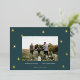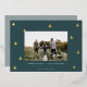 A modern and elegant Christmas holiday card design featuring a horizontal photo on a deep spruce green background dotted with gold foil pine trees. Personalize with your custom holiday greeting, family name and the year beneath.