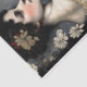 This hauntingly beautiful portrait merges Victorian romanticism with Gothic elegance, featuring a figure in profile adorned in exquisitely detailed damask and brocade. The composition masterfully layers ornate patterns, from the sculptural sleeve detailing to the golden chrysanthemums floating against the shadowed background. The subject's porcelain complexion, enhanced by a delicate rose blush, creates a striking contrast against the dark, theatrical backdrop.