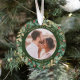 This gorgeous newlyweds holiday keepsake ornament feature a lush, festive wreath of gold leaves, Christmas greenery, and red holly berries on a modern forest green background. Your personal wedding photo goes in the centre along with the words "Married and Merry", and there is even a spot for your name. A second photo goes onto the back. A perfect gift for the newly married husband and wife.