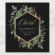 These gorgeous holiday wine labels feature a faux gold geometric frame with matching gold leaves, Christmas greenery, and red holly berries on a black background. The word "Cheers!" appears in modern gold calligraphy. Perfect for your elegant winter wedding or party.