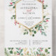 This gorgeous holiday wedding all-in-one invitation features a faux gold geometric frame with matching gold leaves, Christmas greenery, and red holly berries on a modern white background. A detachable rsvp card is included. Perfect for your elegant winter wedding.