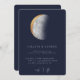 Gilded Moon, wedding invitation. Features, dark navy blue colour background and white typography modern design style template with gilded moon phases on back.