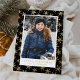 Elegant holiday photo card featuring your vertical photo framed by beautiful gold foil snowflakes with a black background. Personalise the gold foil snowflake holiday card with a custom holiday greeting and your family name. The foil Christmas card reverses to a solid black background.