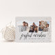 Elegant and festive holiday photo card features three square photos in a collage layout, with a border of shining rose gold foil stars and snowflakes. "Joyful WIshes" or your custom greeting appears along the bottom in white calligraphy script lettering, with your names or family name and the year beneath.
