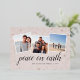 Elegant and festive holiday photo card features three square photos in a collage layout, with a border of shining rose gold foil stars and snowflakes on a pale cameo blush background. "Peace on Earth" or your custom greeting appears along the bottom in white calligraphy script lettering, with your names or family name and the year beneath.