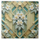 A symmetrical floral pattern with a vintage art deco style, featuring white flowers with yellow centres and light green leaves, set against a background of teal and gold geometric shapes, the design incorporates vertical stripes and diamond patterns, creating a textured, three-dimensional effect, reminiscent of carved or embossed artwork.