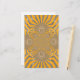 This artwork features a central, ornate mandala-like design in metallic gold and grey. Four stylised, symmetrical elements, also in metallic tones, surround the centre. The background is composed of radiating bands of vibrant golden yellow alternating with textured grey, creating a distinct zebra-stripe visual. Four smaller, detailed square motifs are positioned in each corner, echoing the central theme.