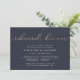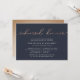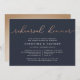 Our elegant, modern wedding rehearsal dinner or cocktail party invitations feature "rehearsal dinner" across the top in looping faux copper foil handwritten script typography on a rich navy blue background. Personalise with your ceremony rehearsal and rehearsal dinner details beneath in modern white lettering. Includes space for the rehearsal timing and church or venue address. A chic design in rich colours for modern couples and elegant events.