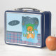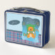 Cute kid metal lunch box with a cartoon ginger cat wearing a hat and a scarf on a snowy day , as well as some blue and purple plaid . Personalise it with the child's name .