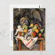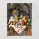 A fine art postcard with the still life painting by the French artist Paul Cezanne (1839-1906) titled, Ginger Jar and Fruit (c. 1895). A large stoneware jar on a table arranged with scattered fruit including, pears and apples.