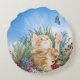 Ginger kitten playing with a butterfly round cushion