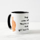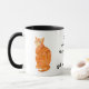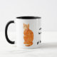 A white ringer mug with a black handle and rim and a handpainted ginger cat. The quote from Mary Bl, reads, 'Dogs come when they're called, Cats get back to you.'