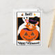 Ginger's an orange cartoon cat in an adorable black & purple witch costume, complete with pointy hat & cloak. She's sitting inside a jack o'lantern. A white ghost floats behind her. Trick or Treat! The background can be any colour.