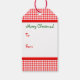 This happy gingerbread boy wears a bow and three red buttons on his suit. Tag has a red gingham border and the text "Merry Christmas!" on the back.