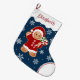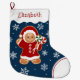 Sweeten up your holiday décor with this charming gingerbread girl Christmas stocking! Featuring a gingerbread cookie girl dressed in a red hooded dress with white trim, holding two peppermint lollipops, this design is full of festive personality. Surrounded by snowflakes on a blue background, this stocking is perfect for children, families, and gingerbread lovers. Add a name for a personalised touch that makes Christmas morning even more special.