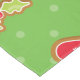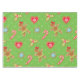 Gingerbread Heart Christmas tablecloth, colourful and fun, features a green polka dotted background with gingerbread girls, red hearts, blue stars, holly and berries, and candy canes!