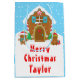 This cute and festive gift bag can be personalised with a name or title, such as daughter, granddaughter, niece, friend etc. It features a cute gingerbread house decorated with red and green candy. Beside it are adorable gingerbread men with gifts, dressed in Santa hats and a scarf. In the background is a bright blue winter sky with elegant falling snowflakes. The text combines decorative and sans serif fonts for a stylish and modern look.