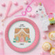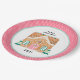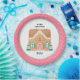 This cookie exchange paper plate features a festive Gingerbread house decorated with pink, aqua and teal gumdrops on a white background with a pink and white polka dot outer border. Above the gingerbread house it text that says "MERRY CHRISTMAS" You can personalise with your family name or year. Coordinates with the Gingerbread Party collection.
