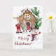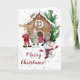 An adorable ginger bread house a Moose couple and a snowman - fun greeting card for the holiday season.