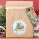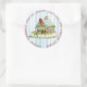 Blue and colourful Christmas sticker with a whimsical gingerbread house and blue and white stripes.