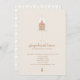 This invitation has a classic gingerbread house dripping in decorative icing enclosed in a glass bell jar or cloche.