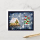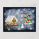 Cheerful holiday scene with gingerbread house, snowflakes, snowman, and tree decorated by pretty red cardinals designed to look like fabric makes this a unique and lovely way to say Happy Holidays.