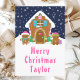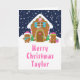 This fun and festive holiday card can be personalised with a name or title, such as daughter, granddaughter, niece, friend etc. It features a cute gingerbread house decorated with pink and green candy. Beside it are adorable gingerbread men with gifts, dressed in Santa hats and a scarf. In the background is a navy pink winter sky with elegant falling snowflakes. The text combines decorative and sans serif fonts for a stylish and modern look. This is perfect for a Christmas gingerbread house decorating party.