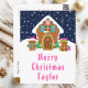 This fun and festive holiday card can be personalised with a name or title, such as daughter, granddaughter, niece, friend etc. It features a cute gingerbread house decorated with pink and green candy. Beside it are adorable gingerbread men with gifts, dressed in Santa hats and a scarf. In the background is a navy pink winter sky with elegant falling snowflakes. The text combines decorative and sans serif fonts for a stylish and modern look. This is perfect for a Christmas gingerbread house decorating party.