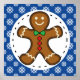 Gingerbread man cookie on a blue white snowflakes pattern background.