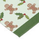 Gingerbread men and holly pattern on festive tablecloth with green trimming.