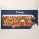 This personalised beach towel makes a perfect Christmas gift for RV owners. It features an illustration of a gingerbread RV. This festive cookie camper is decorated with white icing and red and green candy and set against a navy blue background. The towel is ready to be personalised with a name or other custom text at the top.