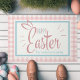 This adorable Easter doormat features a pink and white gingham plaid background with a baby blue and pink "Happy Easter" decorative script adorned with bunny rabbit ears. Personalise by adding your family name.