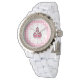 A watch for teachers featuring the logo of The Pink Schoolhouse at centre with pink gingham border. Personalise with your name under schoolhouse. Numerals are pink and black.