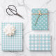 Trio of pastel turquoise mix and match gift wrapping paper sheets featuring classic gingham checks and polka dots. An elegant aqua blue pattern mix for birthdays, weddings, Easter, baby showers or DIY projects. Each sheet is customisable! The vector-based designs ensure sharp prints, even when resized. Celebrate in style with designs by © y.BEE PAPERIE #ZazzleMade #AquaGinghamWrappingPaper #AquaMixAndMatchWrappingPaper #AquaGiftWraps #AquaPolkaDotsWrappingPaper