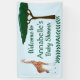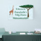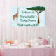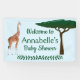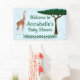 A giraffe stands in front of a tree for a gender neutral baby shower welcome.