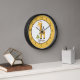 This clock features our original giraffe illustration over a white background with a mustard yellow background dot border that matches the giraffe. The numbers are printed in black. The inside circle is brown. All colours are designed to match with the cute giraffe illustration. This giraffe themed clock would look great in a baby nursery, child's bedroom, or a playroom.