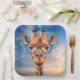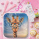 A giraffe wears stylish black-rimmed glasses against a sky background giving it an expressive and whimsical look.