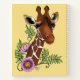 Portrait of a cute giraffe against a yellow backdrop with pink flowers.