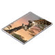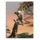 An adult giraffe greets a baby giraffe against the backdrop of an African sunset.