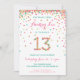 Celebrate your thirteen year old's birthday with colourful gold, pink, mint and teal confetti on these 13th birthday invitations! Featuring your daughter's party details and the number "13" in confetti.