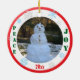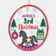 Girl's Name 3rd Christmas in festive red and green and pink typography. Insert for Any Age. Hand-designed gray rocking horse with pink and white star, saddle and circles elements. Insert Year in black on bottom. Whimsical snowflakes in gray and blue, trees, ornament and gift box. Keep Snowman image, or Upload Your Own Image, with Peace on Earth written on the Backside of two-sided item. Original Photography and Design by TamiraZDesigns.