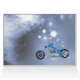 A blonde girl lying across a chopper motorbike with stars and clouds in the background.