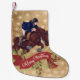 This holiday Christmas stocking features a girl riding a brown horse jumping a Merry Christmas banner. They are set against a golden snowflake background -