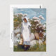 A fine art postcard with the painting, Girl and Laurel (1879), by Winslow Homer (1836-1910) an American artist from the realist movement. A young woman wearing a white apron with a bonnet holding a wicker basket of flowers near bushes of laurel.